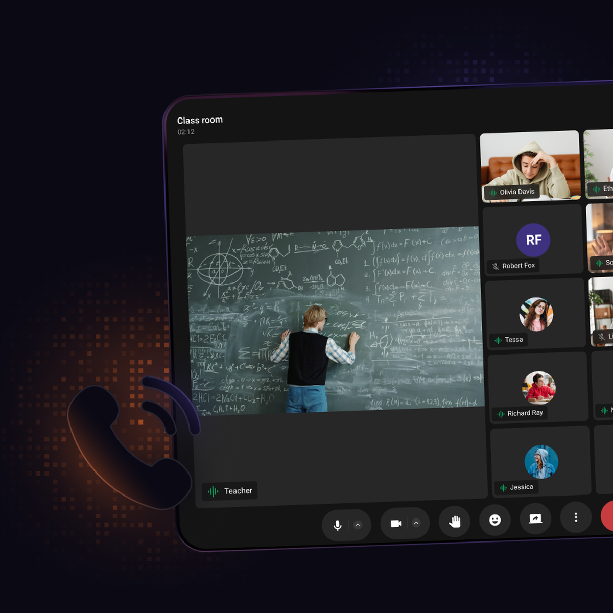 Allow users to present documents, apps or their screens, or interactive boards on call. Available for presenters in broadcast mode. Equipped with detailed call logs and analytics